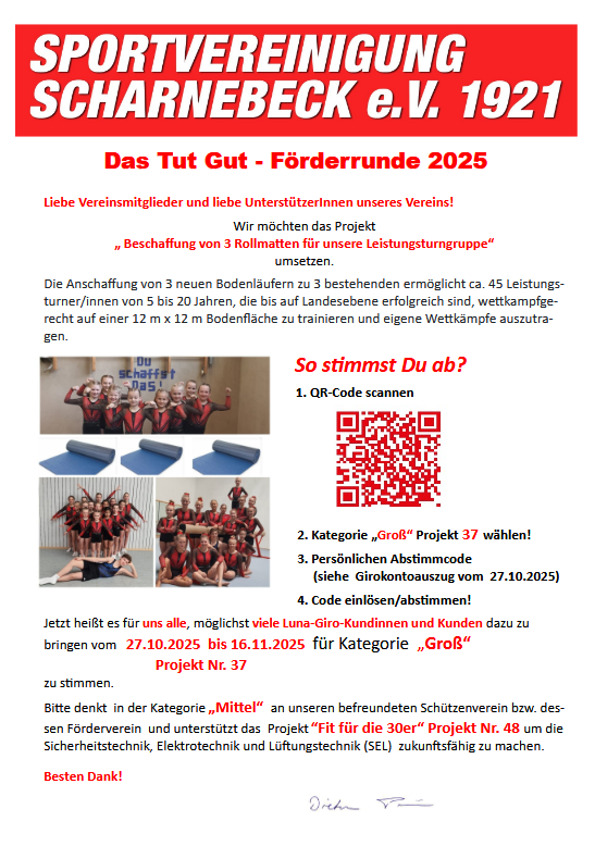 Wir haben für unser Projekt „ Besten Dank an alle, die uns dabei so engagiert unterstützt haben! Besonderer Dank geht an den Schützenverein Scharnebeck und den Förderverein Fußball Scharnebeck, die Ihre Mitglieder motiviert haben unsere Sache bei der Abstimmung mit zu unterstützen. Wir freuen uns riesig! |